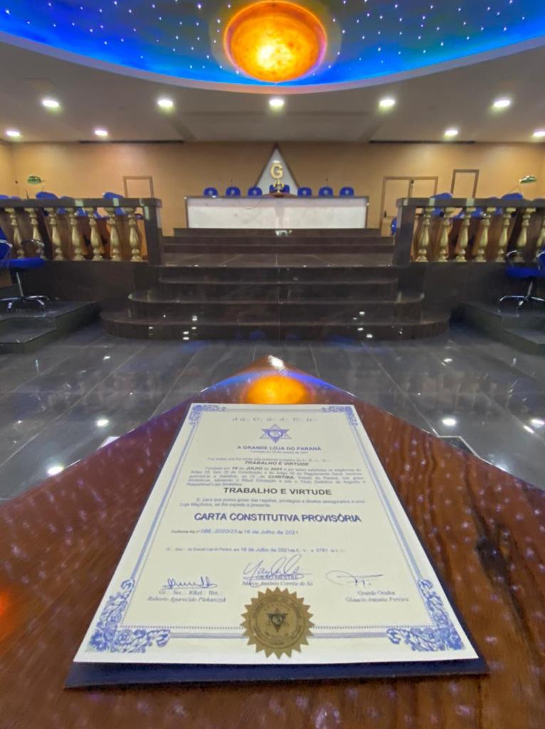 “A Grande Loja do Paraná ganhou mais uma Estrela com intenso brilho em sua constelação”, disse o Sereníssimo Grão-Mestre, Marco Antônio Corrêa de Sá em relação à fundação da ARLS Trabalho e Virtude, durante a solenidade de entrega da Carta Constitutiva Provisória que ocorreu nessa última semana, simbolicamente no Templo Nobre da Grande Loja do Paraná (GLP). A nova Loja trabalhará no Ritual de Emulação, nas quartas-feiras, no Templo Antônio André Jansson, em Curitiba.