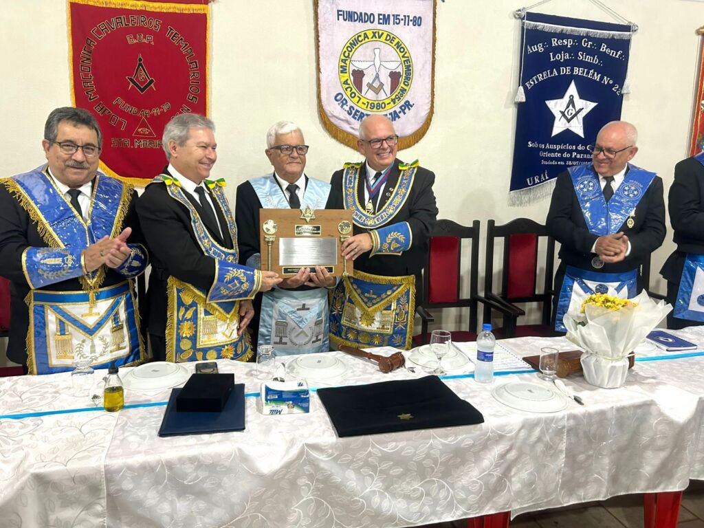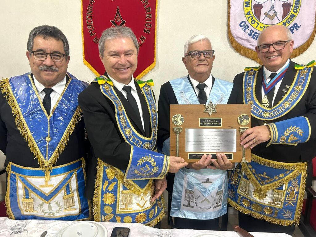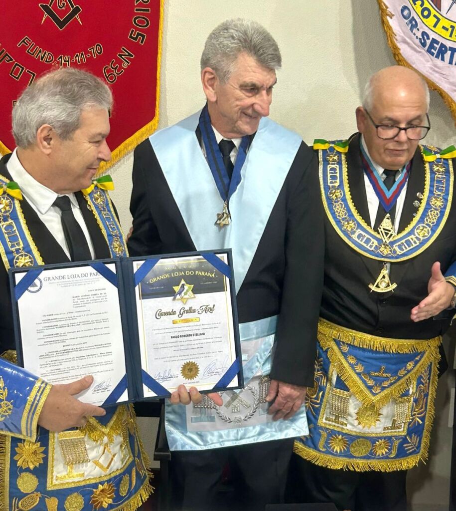Durante o evento, o Grão-Mestre entregou a Comenda Gralha Azul ao Irmão Paulo Roberto Stellato, que ingressou na Ordem há mais de quatro décadas. A homenagem reconhece sua atuação e sua trajetória na instituição.