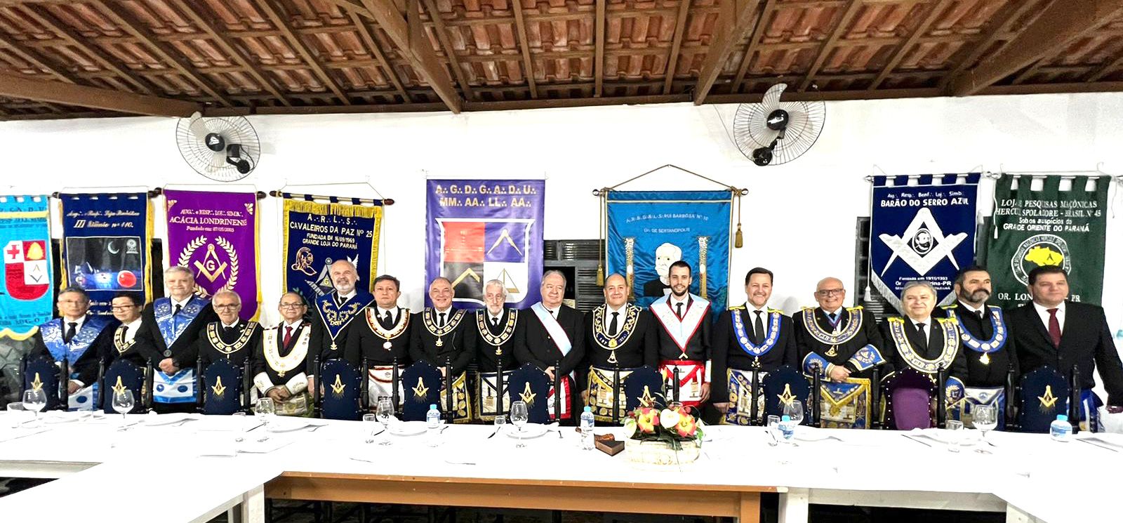 O tradicional Banquete Ritualístico do Vale das Acácias reuniu mais de 250 Irmãos, das três Potências Regulares da Maçonaria Paranaense, no final de julho, no Oriente de Londrina. O evento contou com a presença dos Grão-Mestres da Grande Loja do Paraná (GLP), Grande Oriente do Paraná (GOP) e Grande Oriente do Brasil (GOB-PR), respectivamente os Irmãos Marco Antônio Corrêa de Sá, Cristian Adrian Flores Maldonado e Luís Mario Luchetta.