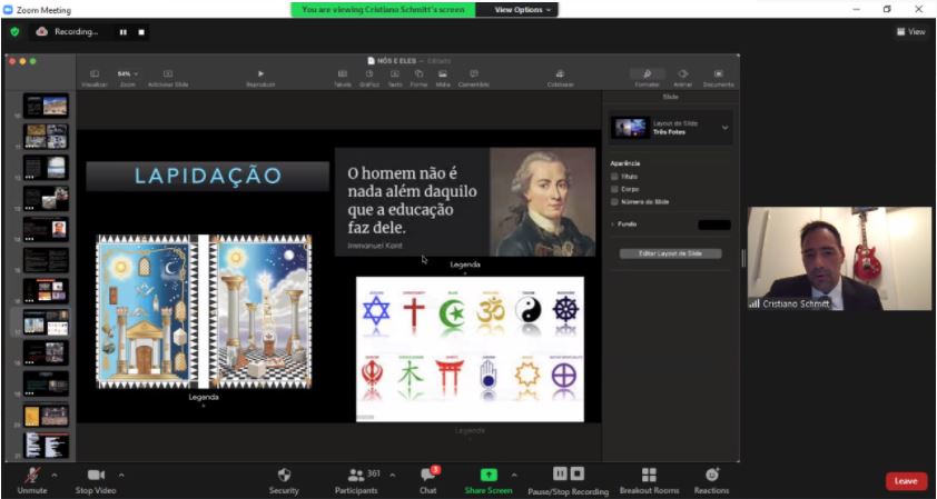 A noite foi abrilhantada pela apresentação do Grão-Mestre da Grande Loja Legal /Regular de Portugal, Irmão Armindo Azevedo, que falou sobre a Maçonaria na Europa e os reflexos da pandemia, e do Irmão Cristiano Marcos D’alcântara Shimitt que fez uma análise histórica das raízes da solidariedade na formação maçônica, destacando o lapidar e a erosão das pedras brutas.