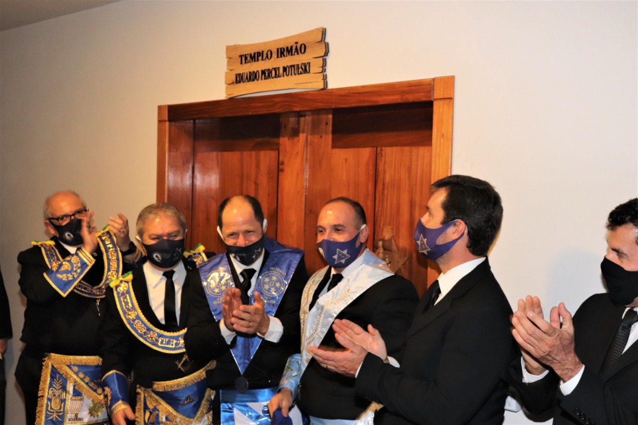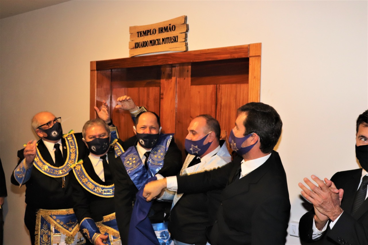 Na oportunidade e após a sessão, foi descerrada placa afixada na porta do Templo: “Templo Irmão Eduardo Percel Potulski”, em homenagem ao saudoso Irmão , primeiro Orador da Loja.