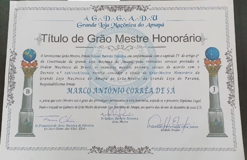 Ainda na ocasião, o Irmão Tupam repassou ao Irmão Marco Antônio o Título de Grão-Mestre de Honra, da Grande Loja Maçônica do Amapá (GLOMAP), a pedido do Sereníssimo Grão-Mestre, Irmão Ulisses Barreto Teixeira. Ainda nesse mesmo período, o Irmão Marco Antônio recebeu também o Título de Grão-Mestre de Honra, da Grande Loja do Estado de São Paulo (GLESP).