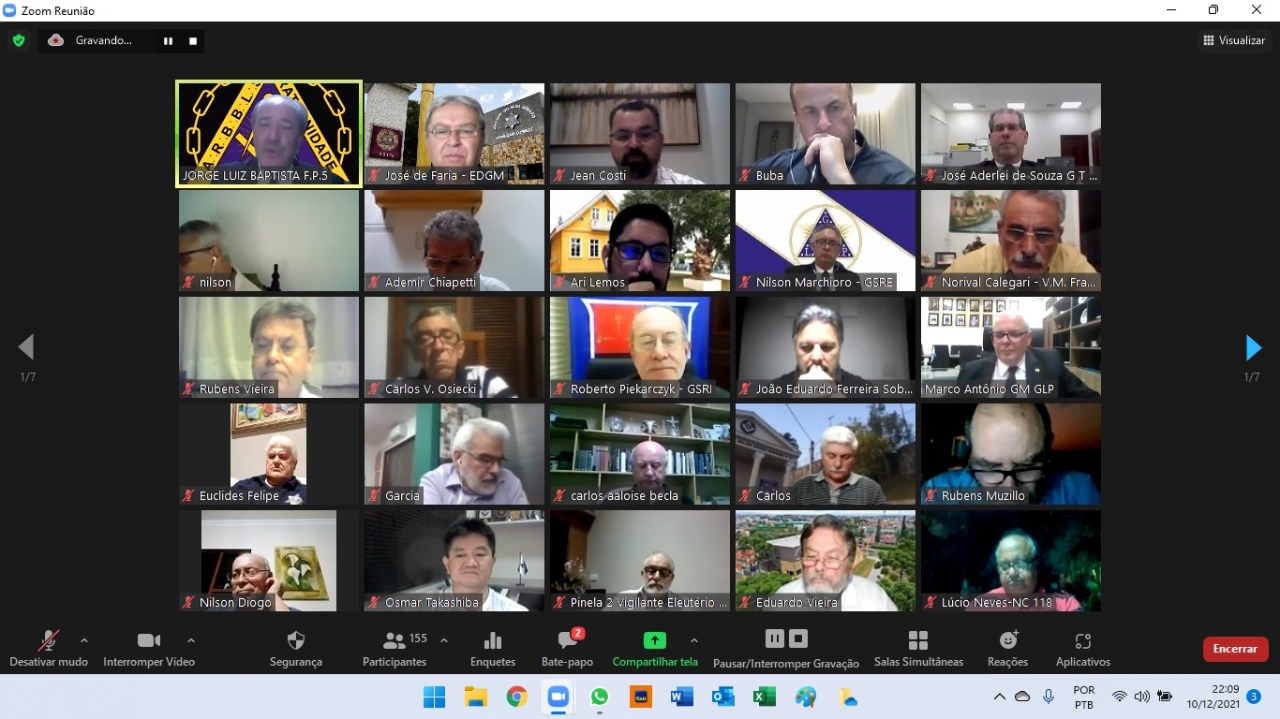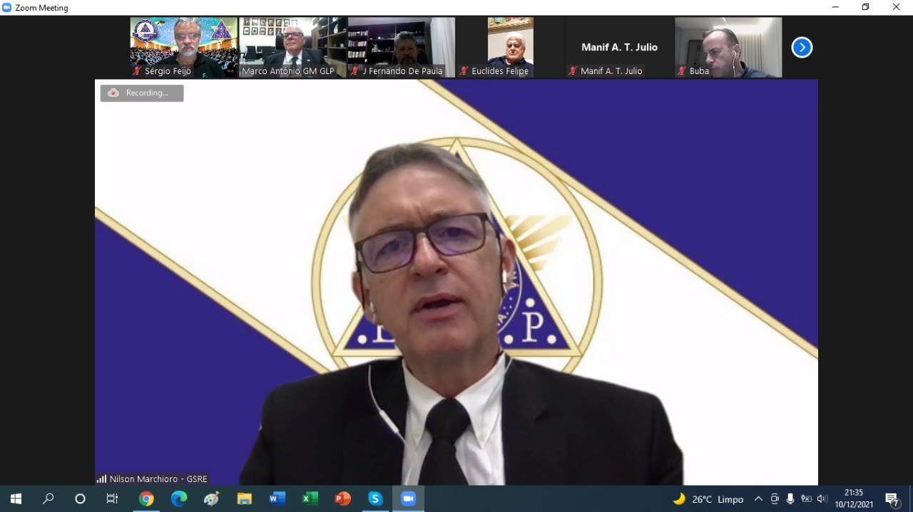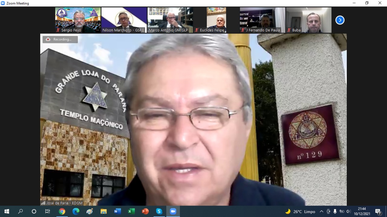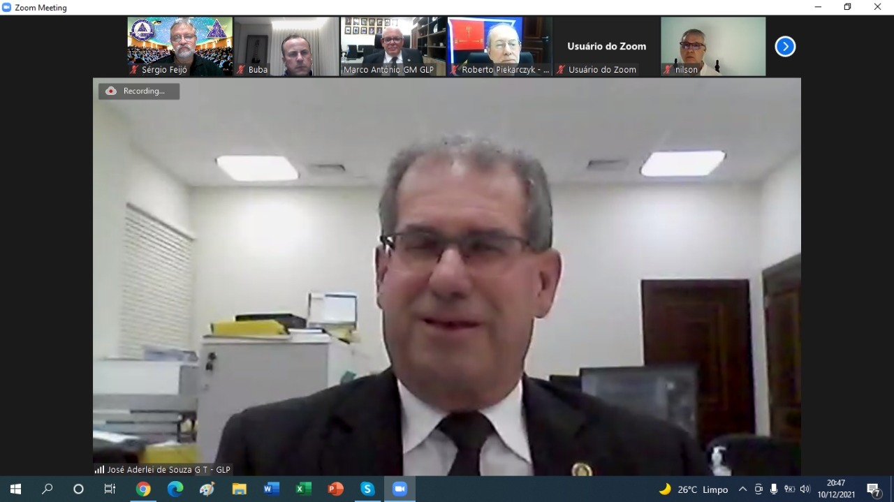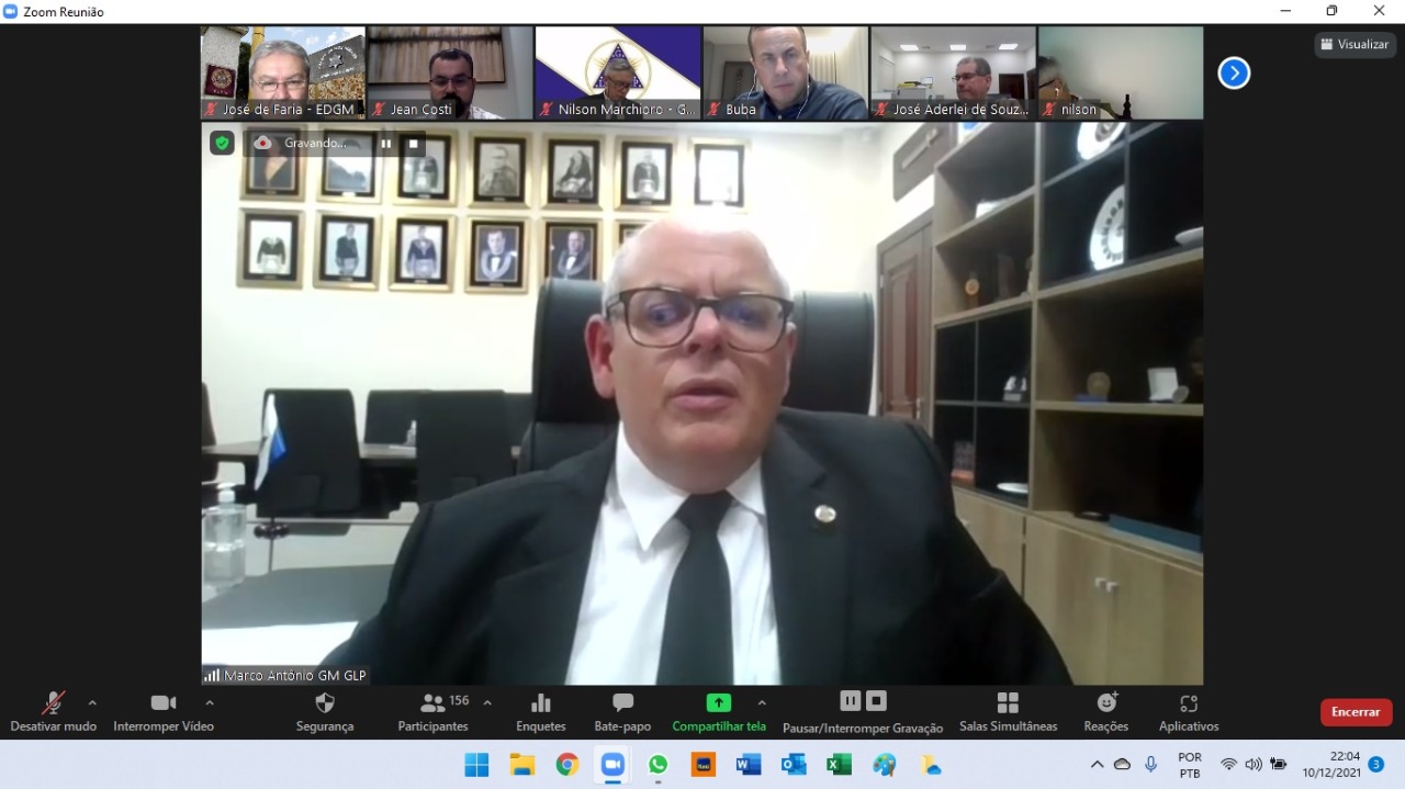 A Grande Loja do Paraná (GLP) realizou a quarta e última Assembleia Geral Ordinária Legislativa de 2021 nessa sexta-feira (10), no formato virtual. A data foi marcada pela apresentação do relatório resumido de atividades do Grão-Mestrado em 2021, pela apresentação da previsão orçamentária para 2022 e, ainda, pela apresentação do livro comemorativo e alusivo aos 80 anos da GLP.