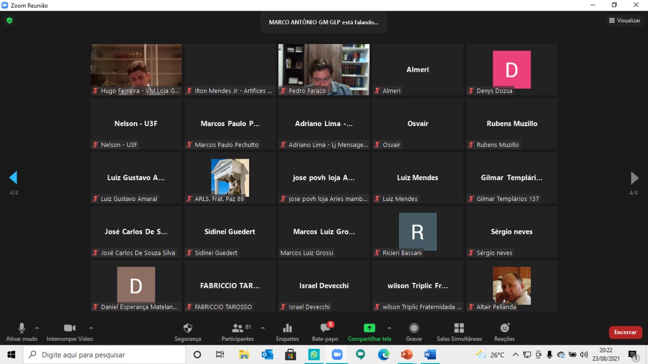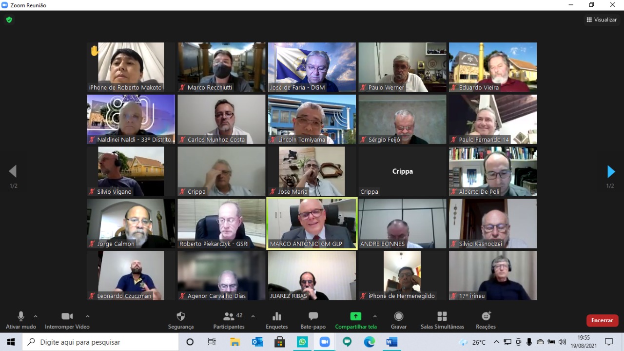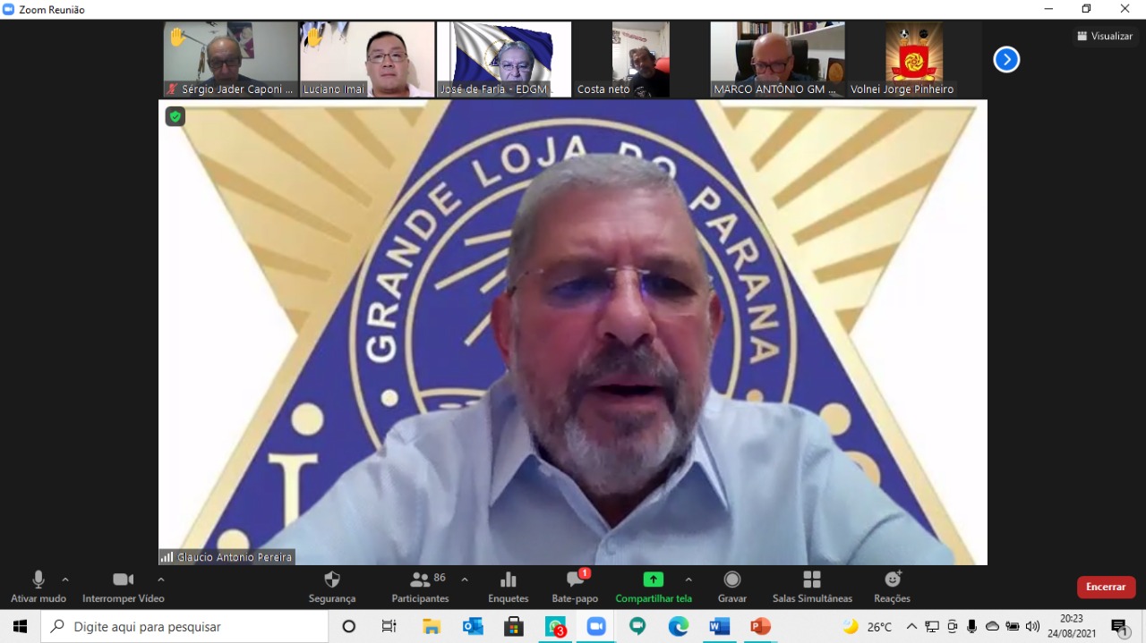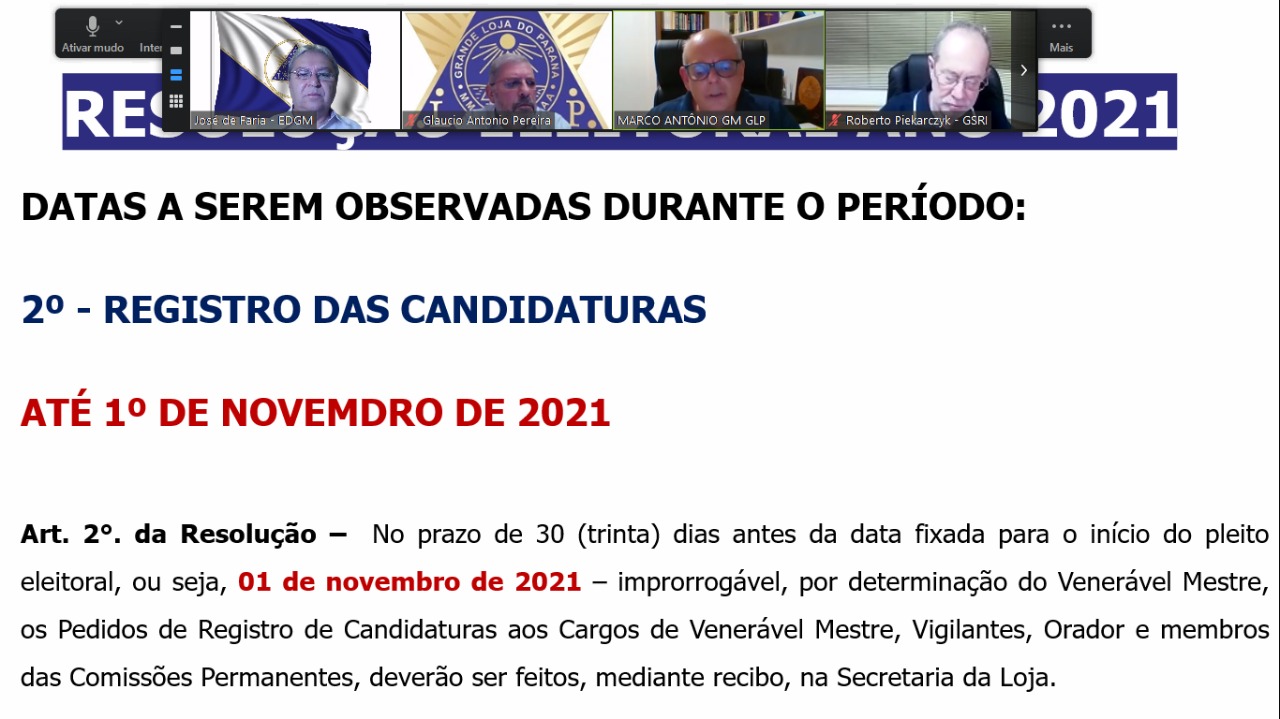O Sereníssimo Grão-Mestre da Grande Loja do Paraná (GLP), Irmão Marco Antônio Corrêa de Sá, e o Eminente Deputado do Grão-Mestre, Irmão José de Faria, estiveram reunidos virtualmente nos dias 23 e 24 de agosto com os Veneráveis Mestres das Lojas da jurisdição para tratar da elaboração da Resolução Eleitoral, relativa à administração das Lojas para o período de 2022 e 2024.