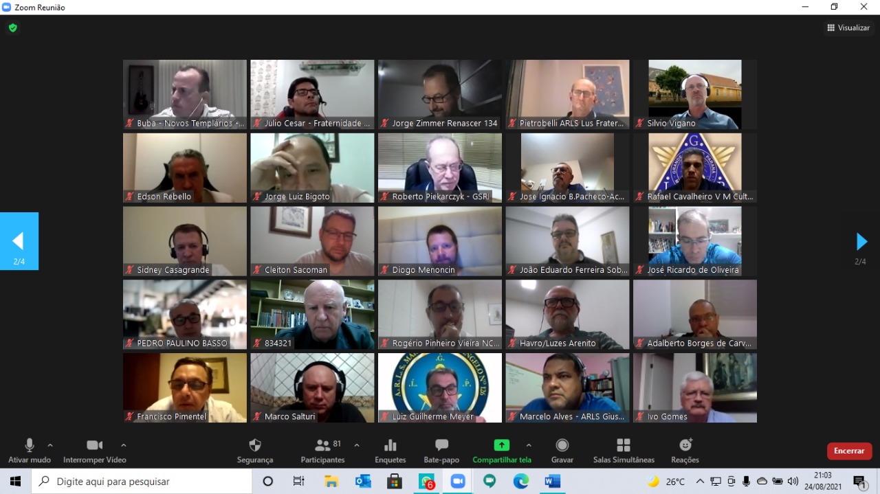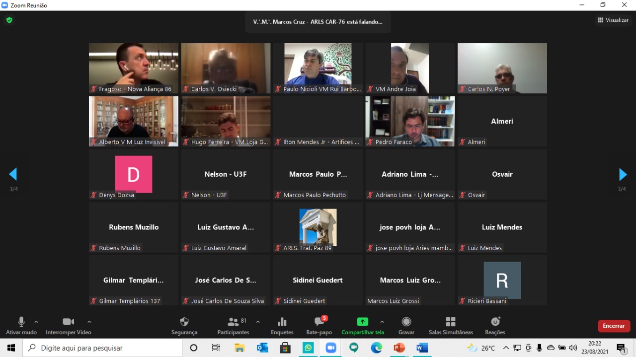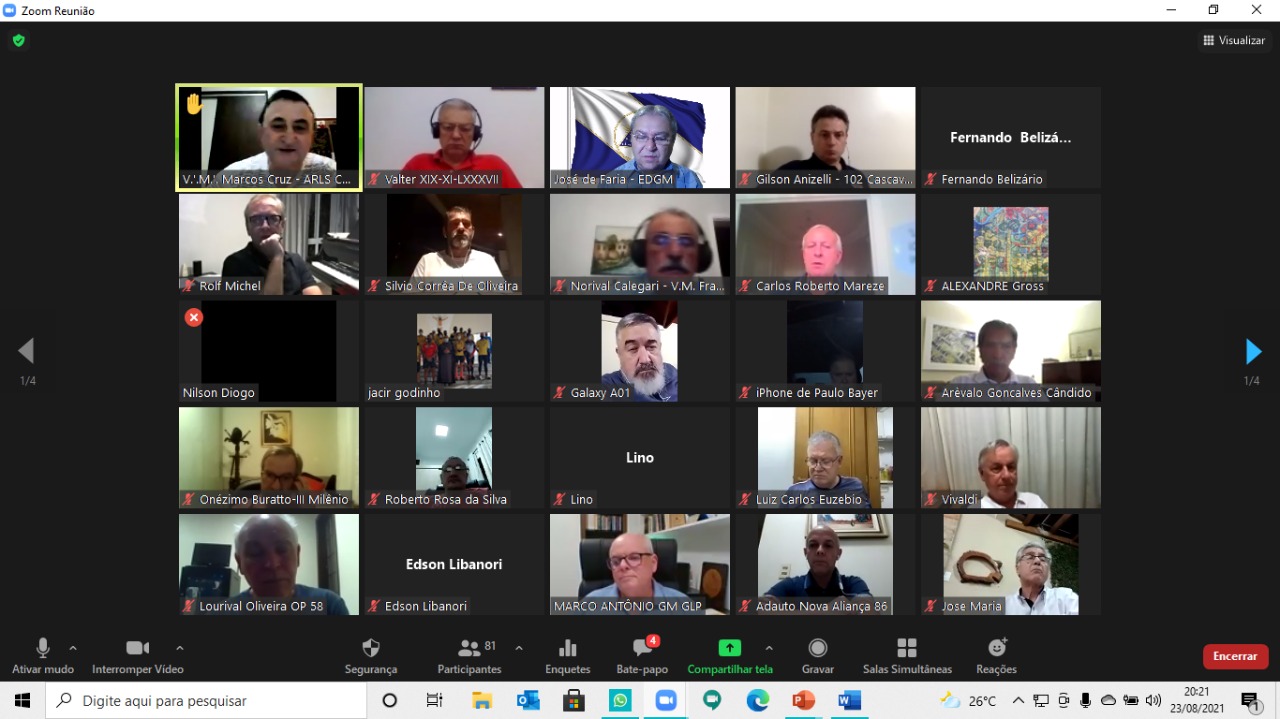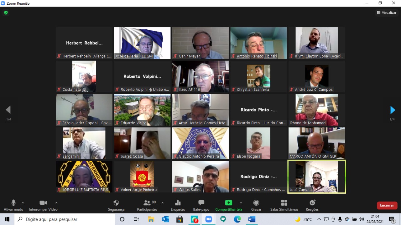 O Sereníssimo Grão-Mestre da Grande Loja do Paraná (GLP), Irmão Marco Antônio Corrêa de Sá, e o Eminente Deputado do Grão-Mestre, Irmão José de Faria, estiveram reunidos virtualmente nos dias 23 e 24 de agosto com os Veneráveis Mestres das Lojas da jurisdição para tratar da elaboração da Resolução Eleitoral, relativa à administração das Lojas para o período de 2022 e 2024.