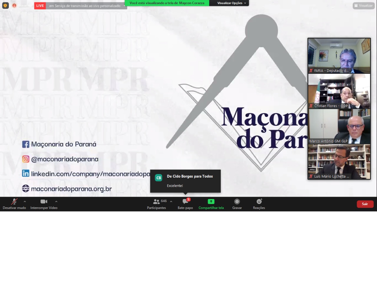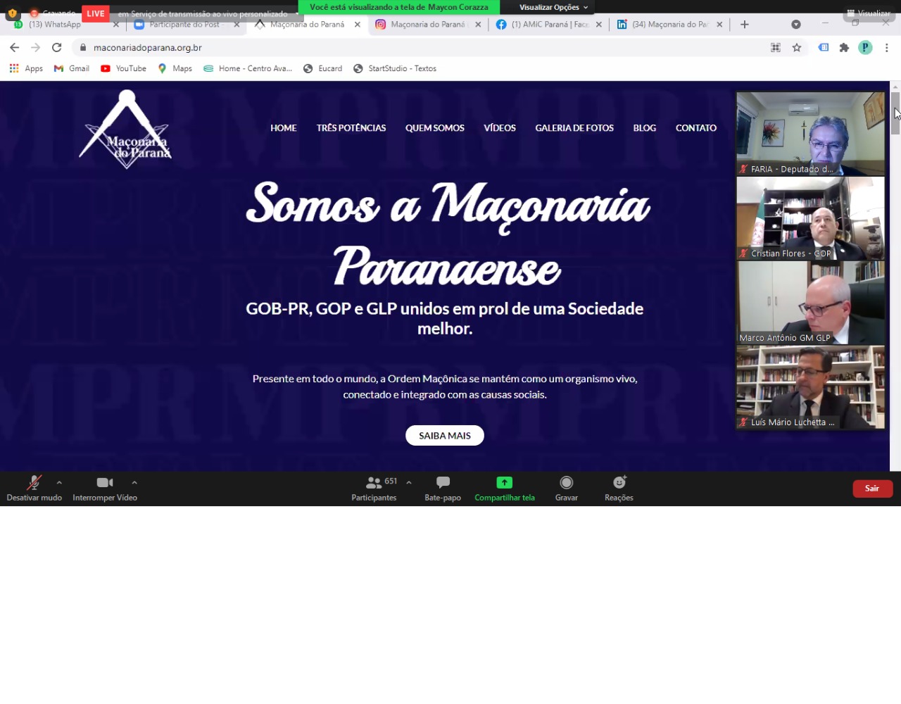 “A iniciativa reforça a unidade da maçonaria regular no Paraná, mostrará o que é a Ordem e a nossa preocupação em tornar mais feliz a humanidade. É algo que ajudará ainda informar e  esclarecer possíveis impressões equivocadas ao nosso respeito”, explica o Sereníssimo Grão Mestre da GLP, irmão Marco Antônio Corrêa de Sá.  O Maçonaria do Paraná é uma idealização conjunta das três potências e terá perfil nas redes sociais: Facebook, LinkedIn, Instagram e Youtube.