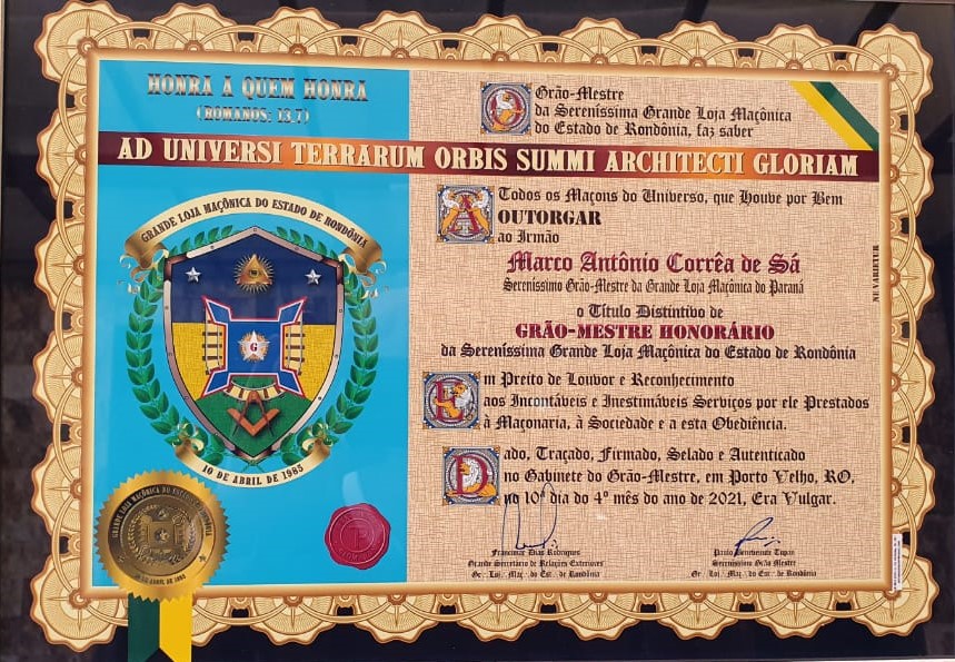 O Sereníssimo Grão-Mestre da Grande Loja do Paraná (GLP), Irmão Marco Antônio Corrêa de Sá, foi condecorado com o título de Grão-Mestre Honorário da Grande Loja Maçônica de Rondônia (GLOMARON). O título foi concedido pelo Sereníssimo Grão-Mestre da GLOMARON, Irmão Paulo Benevenute Tupan, como sinal de reconhecimento, amizade fraterna e colaborativa.